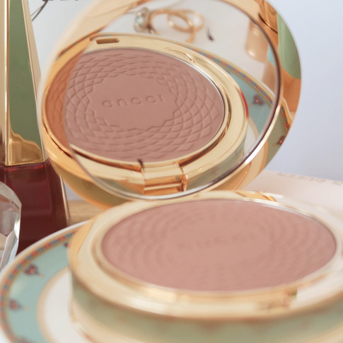 Poudre De Beauté Éclat Soleil neither looks/feels powdery, nor has a lot of kick up to it. This is a lightly scented formula. Similarly to lipsticks, the fragrance used here has fresh floral (rose) notes to it. It reminds me a lot of my favorite scent by Dior called Miss Dior Blooming Bouquet. I absolutely love it. I must add though - it pretty much disappears once the product is applied. However, if your skin is extremely sensitive to fragrance, you might want to consider other options. I have sensitive skin too, but it rarely reacts to fragrance, which is why I have experienced no issues with this Gucci guy.